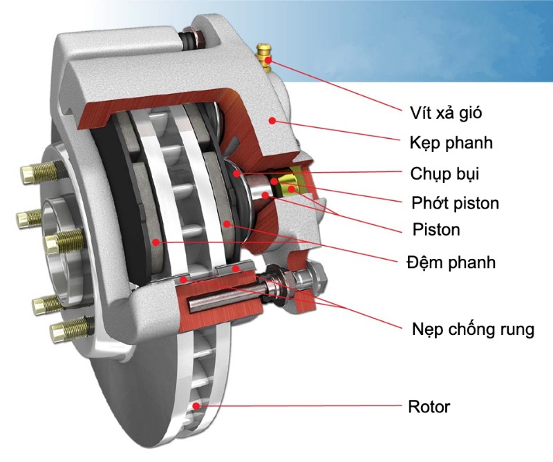 Khi người lái đạp vào bàn đạp phanh, áp suất dầu trong đường ống dầu và xi lanh của bánh xe tăng lên, đẩy piston và má phanh ép vào đĩa phanh. Lực ma sát giữa má phanh, đĩa phanh và moay-ơ làm bánh xe giảm tốc độ dần và dừng lại theo yêu cầu của người lái.